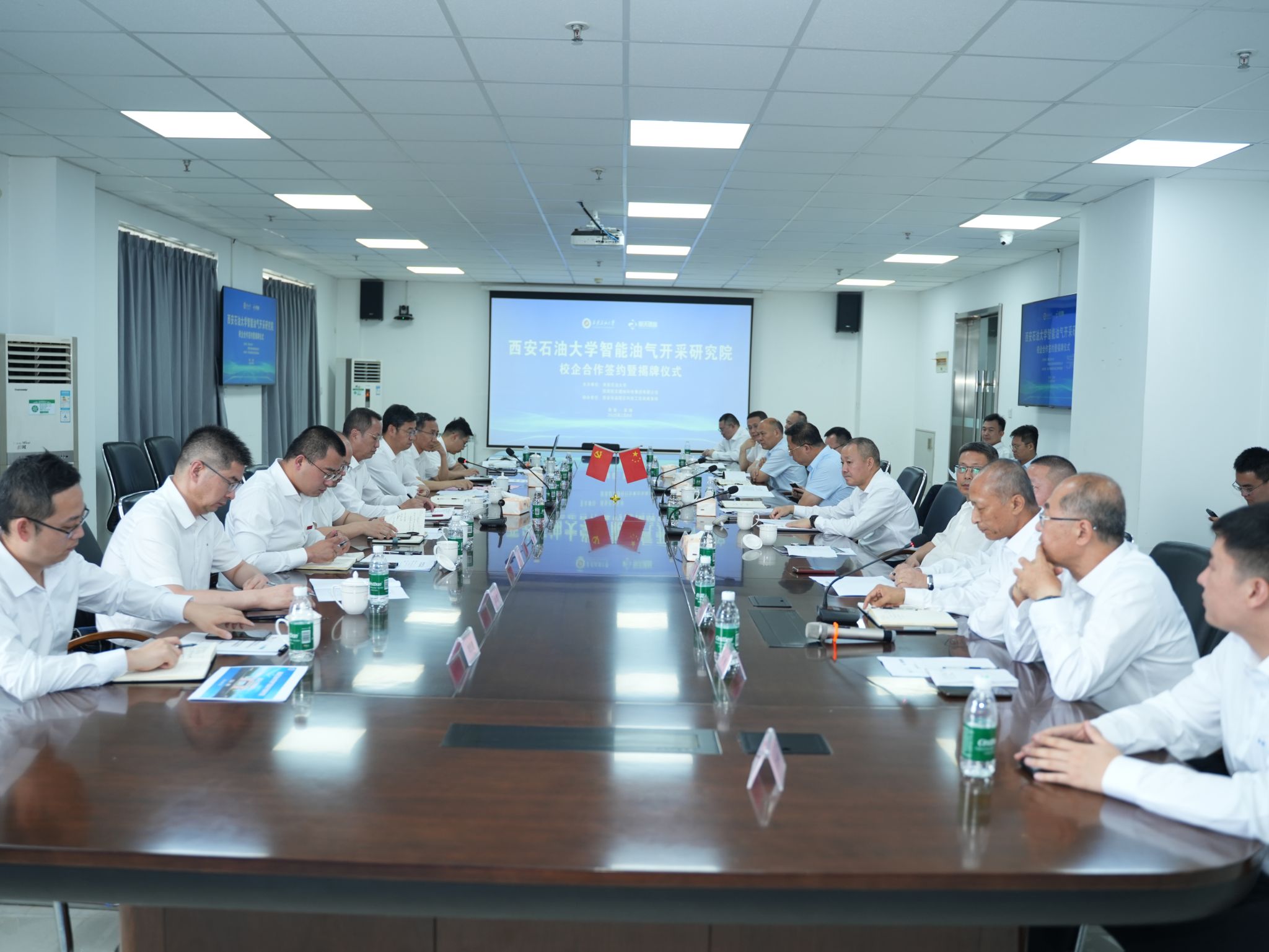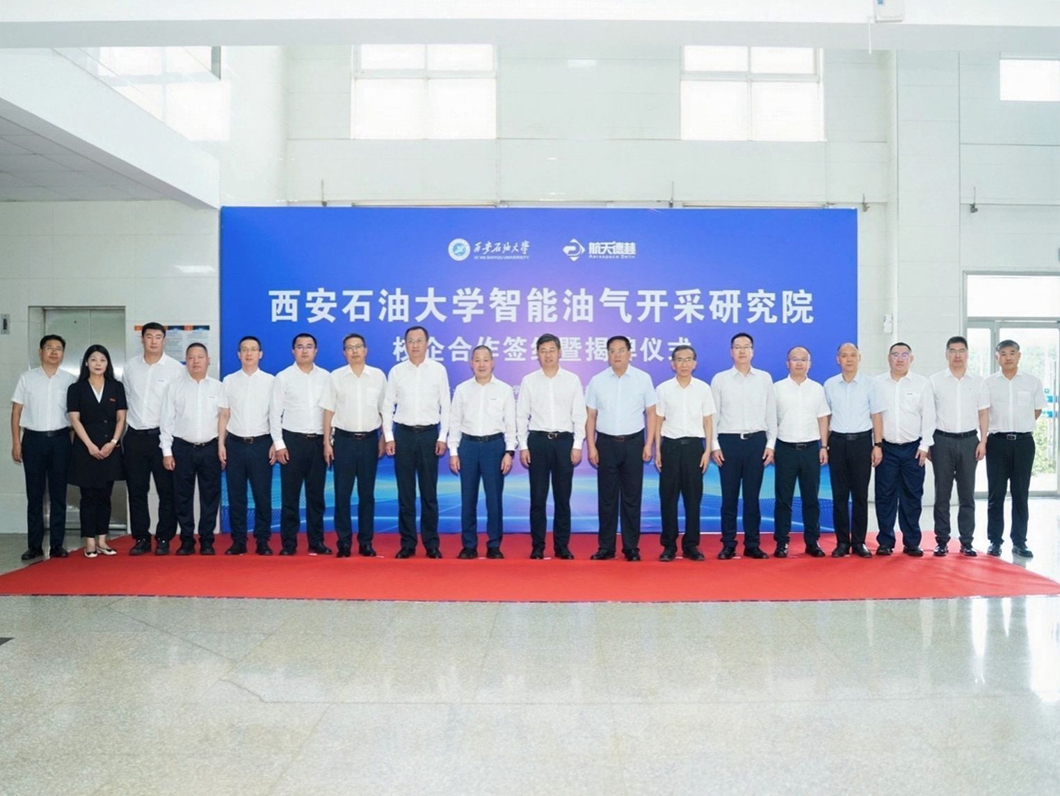 7月8日下午,我校与陕西航天德林科技集团有限公司(以下简称“航天德林”)在企业会议室举行共建智能油气开采研究院合作协议签署暨揭牌仪式。高陵区委副书记、区长邹晓刚,高陵区委常委、常务副区长陈灵,高陵区政协党组副书记、副主席、西安泾河工业园党工委书记、管委会主任谭胜利,航天德林集团董事长林忠灿,总经理林宗南,副总经理林本常、林辰厚、付刚、李顺宏以及我校校长王进富,党委委员、副校长张荣军出席会议。会议由我校党委副书记张木主持。