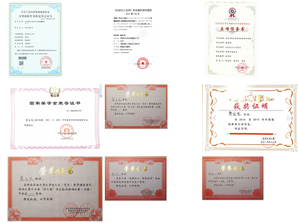 “喜欢不是能力,坚持才是能力。”黄云龙先后获得过第十届“挑战杯”陕西省大学生创业计划竞赛铜奖、第五届“互联网+”大学生创新创业大赛陕西省铜奖、第七届“互联网+”大学生创新创业大赛陕西省银奖、首届海洋工程设计大赛知识竞赛三等奖等多个奖项。此外,他在2020年参加的大学生创新创业项目被立为国家级项目,还与老师共同取得“不同完井方式的气井产能求解软件V1.0”软件著作权,这些都不可谓收获不丰。